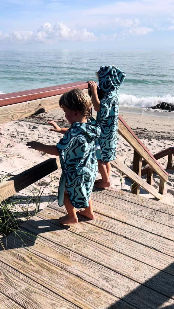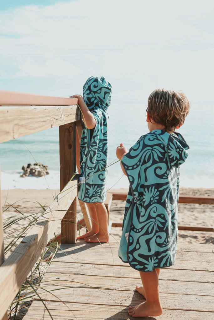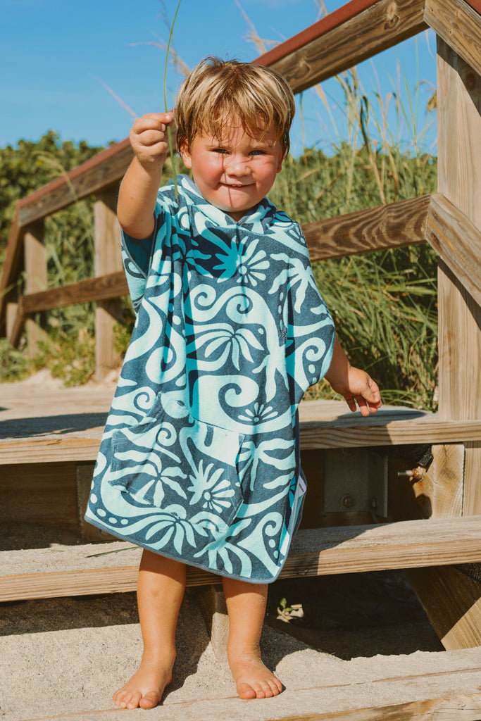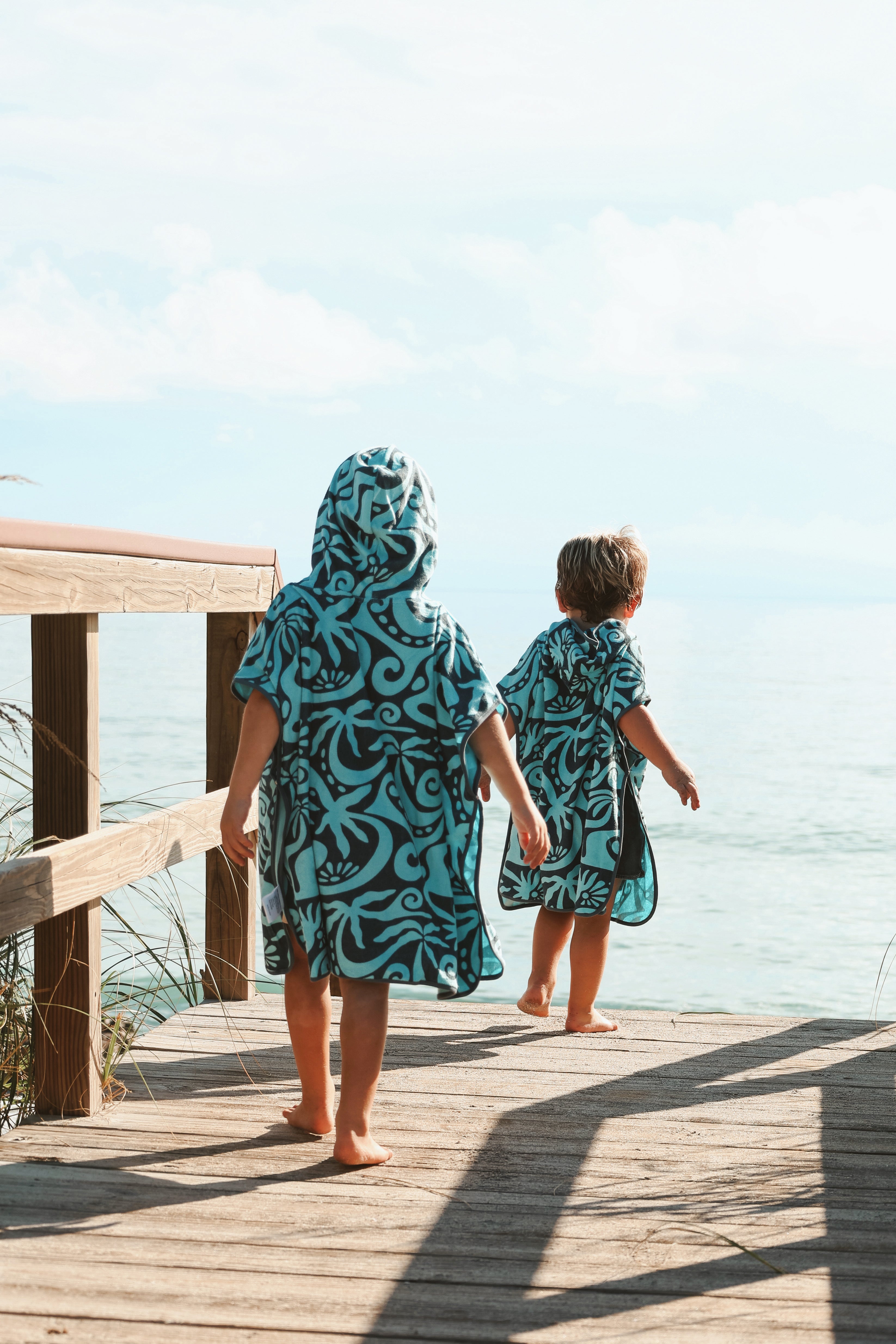Crafted from 100% cotton terry for that cozy, just-right softness, this towel poncho features a roomy hood, secure snap closures at the sides, and a kangaroo pocket for sandy treasures or chilly hands.