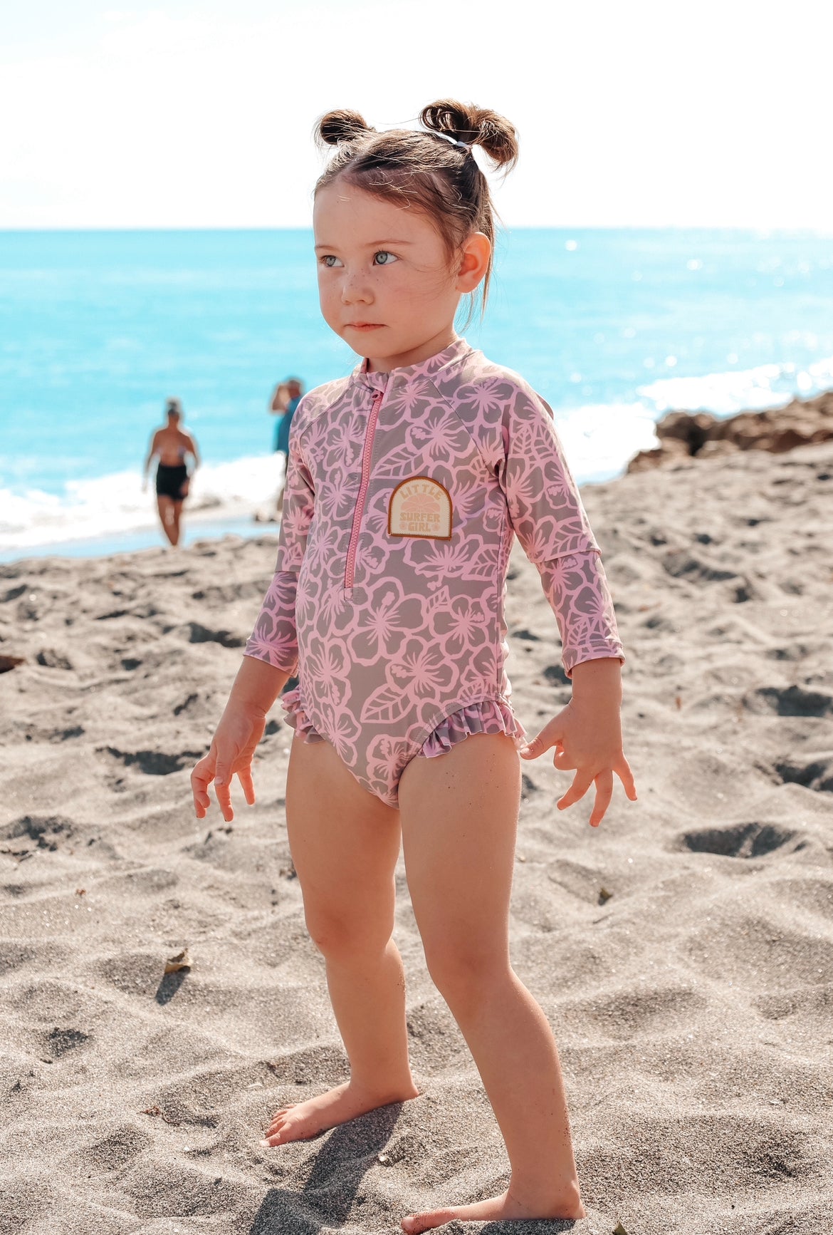 Brown Hibiscus Long sleeve Little Surfer Girl logo swimsuit
